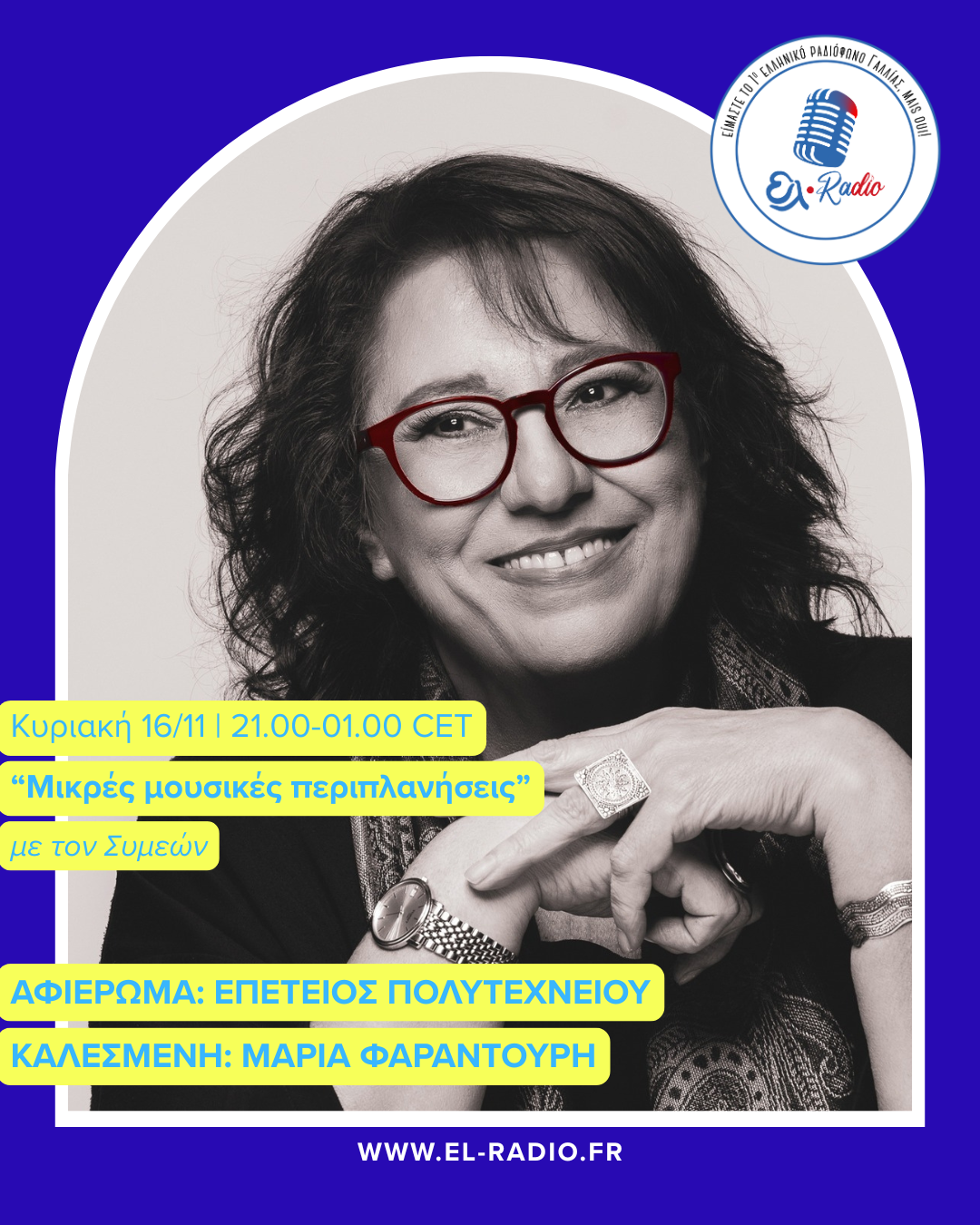 - GR ελ-Actualités La vie est une chanson Mardi 21:30-23:00 CET Avec Eftychia : l'actualité de Grèce et de France, avec un accent sur l'actualité artistique et musicale d'intéret pour la communauté grecque en France. La culture à la lumière de l'histoire, du cinéma, du théâtre, des festivals et expositions, de la cuisine: